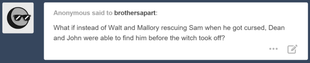 Before she could get the blast off, someone slammed against the door. It shuddered. John Winchester’s voice could be heard outside the door. “I’m coming boys!”
