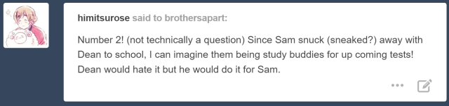 Sam scoffed, taking a few steps on Dean’s back. He’d started out perched on Dean’s head so he could read over the assignment, but Dean spent so much of his time grumbling over the work, he was still on the same page five minutes after Sam had finished.