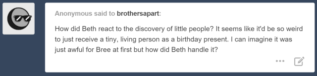 Beth was a little girl at the time. She thought it was the coolest thing ever, like a tiny living doll. The way the Mangas think of Bree is more like she’s a pet. They just thought of it as giving their daughter a new pet. They impressed on her to keep Bree secret. Over the years, they slowly bonded together (stockholm syndrome, but at least Beth didn’t take advantage). She even did all she could to keep her brother from ever laying hands on Bree.