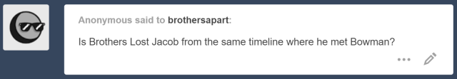 Actually, the only Jacob in the Brothers Apart stories/AU’s that is from the timeline where he met up with Bowman will be the Jacob that will appear in Brothers Apart itself in a future story. Otherwise, each time you see Jacob Andris appear, it is a different Jacob who took a different path… just like how Sam and Dean are different in each one.