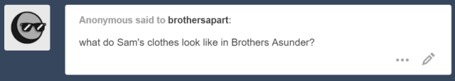 Sam’s clothing in Brothers Asunder is all sprite made (with a few differences, seeing as he doesn’t have to accommodate wings). Generally, that means soft, earthy-colored cotton clothes of simple design. His shirts would mostly be simple brown or green garments – sprites don’t do buttons.