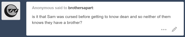 Now all I can see is a wee baby Sammy getting cursed to be small! That poor kiddo, not knowing he has a big brother out there and Dean growing up completely on his own. It’s hard enough on Dean to lose Sam when he’s ten, here he’d spend his entire life without him.