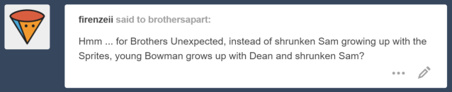 Cute guess! Kinda the opposite of Brothers Asunder, but with a fluttering Bowman. He’s only five in the story, so they’d have their hands full with a wee little sprite that likes to just run off when he gets excited.