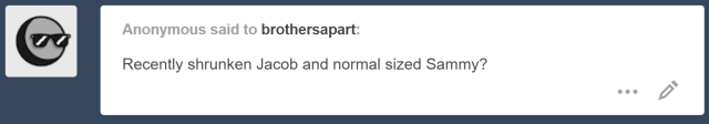 On April 18, 2016December 13, 2018 By nightmares06In Uncategorized Cute idea, but if this happened, Dean would still be around! Share this: Click to share on X (Opens in new window) X Click to share on Facebook (Opens in new window) Facebook Like Loading...