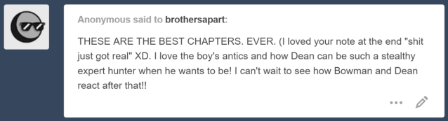 We’re so glad you’re enjoying them! Having the brothers in the Wellwood has to be one of our favorite parts, and of course now Bowman is getting himself in trouble by startling a hunter. Dean is ready for attack, and not expecting a sprite to make such a sound from behind him!