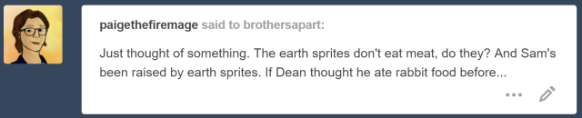 Hah, it’s true! The wood sprites of Wellwood are all vegetarians. Interestingly enough, when Sam arrived, one of the first things the sprites did was see what their Archives had on humans. They discovered there that humans do eat meat, and then came an unbearably awkward conversation with Sam. It was hard to figure out how to bring it up with him, but it was kind of important that they know … would a human eat a sprite? And did they need to figure out a way to get meat for him, or could he survive without it?