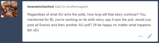 That said, once the first story of each AU concludes, we’ll go back to another poll to pick the next. We won’t have the entire AU post all at once, and this will give us the time to write more of the AUs ahead of time. More stories get added to the poll each time a story ends, and we go on from there! So it’s up to you guys what goes up. We’re handing over the reigns, if not the AU names.