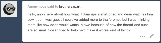 Nevertheless, it’s not a prompt I’d do with the brothers. Like I said, Sam’s not skilled with sewing in my ‘verse. If Dean saw Mallory or Krissy at work with a needle, he would be in awe, and the same goes for Oscar, who has his own set of sewing supplies. Sam, however, is more likely to make a mess of things while Dean, despite his thread being closer to yarn for Sam, might have a chance of fixing it. It’s just like fixing up doll clothing, which isn’t impossible, especially for a man used to working with intricate equipment and crafting his own weapons.