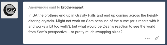 Well, this wouldn’t really be a scenario for me. I’ve never watched Gravity Falls, so I lack any understanding of the show itself. Size swaps, as much as I love g/t interactions, have never really been my thing. You might see it crop up in a story or two, but I’m not likely to take any prompts for it. Gotta save my few ideas for the stories.