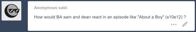 Can you see Sam’s face when the door opens and in strolls his older brother, predictable knock and all to announce he’s there, only there’s a kid, and god he looks so familiar and then Sam realizes it’s the Dean he remembers from right when he got cursed…