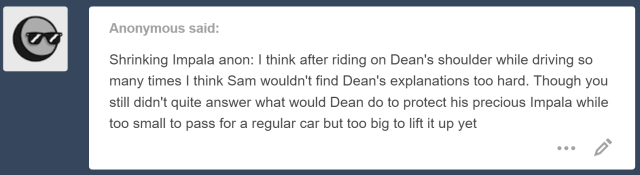 If Bobby’s busy, Dean will sit there, watch her shrink, and give his angry face to anyone that gets too close. That’s his crazy car.