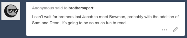 Of course, the brothers will have to be there, too, if nothing else to look after their tol while he deals with this winged guy their size. Considering Dean and Bowman’s headbutting in A Lich of Sense, I bet they’d be so very entertaining if they go around at the same scale!