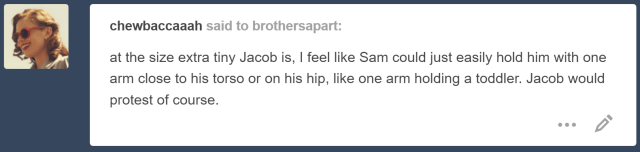 Oh, Jacob. To be teddy-sized to a smol. Sam definitely could XD Jacob has to put up with a lot of teasing from his friends at times, and Sam is happy to supply.
