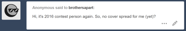 No cover spread yet, but when the cover spread comes, it’ll be attached to the first seven stories of Brothers Apart! The contest is one of my favorite times of year, and I’m looking forward to seeing you and everyone there! 😀