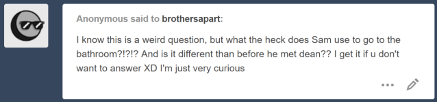 Afterwards, it became easier. Sam can simply use the sink in the bathroom. He’s able to get himself around the entire motel room without any help, and he doesn’t have to worry about being grabbed if he’s out in the open. For his teeth he can snitch some toothpaste from Dean while he’s up there. There’s only been one time Dean almost walked in on Sam while he was using the sink, and the scolding Dean got sent him almost running.