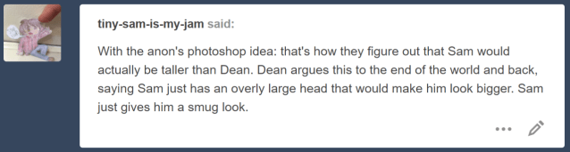 They would bicker forever about the results to that one, since perspective is such a bitch to figure out in that type of scenario. Good thing BA Sam already has solid proof he’s the tallest, and BT Dean went through all the trouble of figuring out a scale for his little brother so one day he’s going to measure Sam and discover his ‘little’ bro has inched his way up to taller than Dean.