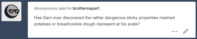 Sam is lucky enough to have not run into this sticky situation! He didn’t go to the motel kitchen when it was in use, so no accidental tumbles happened there, and when they were at Bobby’s, most of the food they cooked was quick and easy to prepare. Dean didn’t spend much time in the kitchen (Bobby chased him off a lot for “Eatin’ all his damn food”), so he never got the chance to experiment.
