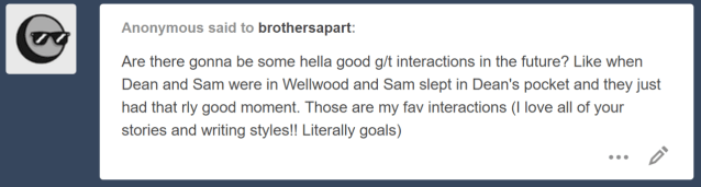 I might be slightly biased, but I certainly think so! 🙂 The g/t interactions are what we love the most! Of course, some stories are more chill while others are overflowing with the different interactions, but that’s just how things go when writing for the long run. Like a Moth to Flame, for instance, has some of my absolute fave moments between the brothers, thought they come at a cost.