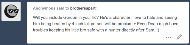 Any character from Supernatural has a chance of walking their way into any of the fics at any time, so it’s perfectly possible that we’ll see the resident crazy hunter come along. Let’s hope he doesn’t cause too many problems for the boys, considering how hell-bent he was on killing Sam in the series, and now Sam doesn’t even get to look human at his size!