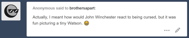 (For anyone that doesn’t know, John Winchester, though I love the character, is one of the hardest people for me to write, so you won’t see him smol in any of my stories. He is a background character for me.)