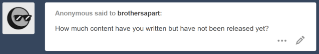 If we just count all the unedited stories we’ve written, there’s about 20ish stories waiting. Much less than that number has been edited, and most are around 10 chapters, give or take a few, but then there’s some (like the horror story) that have far, far more chapters waiting to go up.
