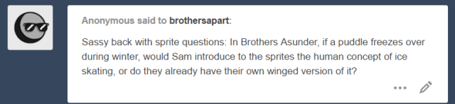 However, now I can’t stop picturing a tiny Sammy bundling up, and bundling up a young, fluttery Bowman to go out and play in the snow. They could make some pretty spectacular igloos, and if they did find a frozen puddle, Bowman would probably have a lot of fun sliding around. Before anyone knew it, there’d be more sprites giving it a try. They’d all need to huddle close for warmth once they went back inside, though!