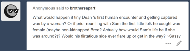 If Dean caught a tiny girl, he’d feel just awful XD As we’ve seen, both brothers flail when a girl or woman gets emotional on them, so some tears and he’ll be hard-pressed to keep her trapped. How dangerous can she be?