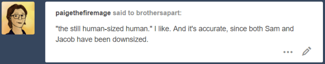 On March 8, 2017December 9, 2018 By nightmares06In Uncategorized ( Original post ) Dean is the lucky winner of the size contest in this story. He gets to stay normal. Share this: Click to share on X (Opens in new window) X Click to share on Facebook (Opens in new window) Facebook Like Loading...