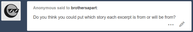 We won’t announce the story name when we post excerpts, and we won’t say which stories are from which AUs, but we do put a tag on each excerpt that points to the name for when the polls come out (unless it was written before we started excerpts, there’s still a few stories that were never excerpted).