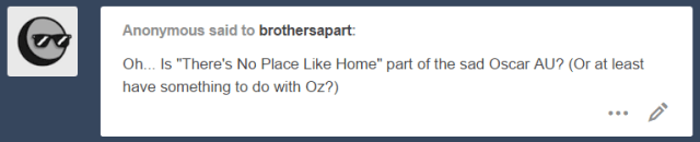 I can say that There’s No Place Like Home is not part of the sad Oscar au, because that lil series doesn’t get excerpts while tnplh did. I just write new installments as they come to me (mostly when I’m super stressed and need a good punching bag healthy outlet for my feels). They don’t get edited or anything, but sometimes I have @nightmares06 and/or @borrowedtimeandspace beta them so they can yell at me.