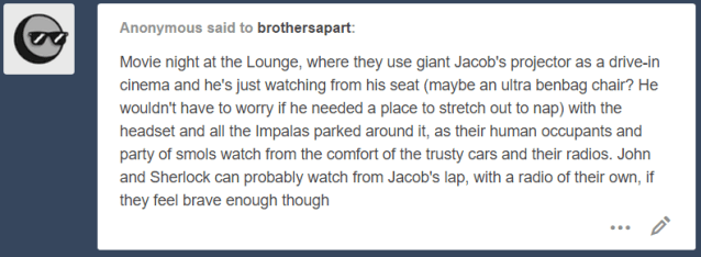 A calm, relaxing outdoorsy moment for them all! I’m sure the Deans would all squabble over the best movie to watch before all agreeing on one of the Godzillas, and the Sams all rolling their eyes and trying to nudge everyone towards an episode of Star Wars. Jacob has a great view no matter where he’s sitting, since the Impalas are so low to the ground, and he will be bemused to see how protective all the different Deans would be of their Impala, which is clearly the best Impala there, how dare their car be compared to those impostors.