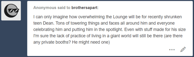I don’t think smol kiddo Dean will be too overwhelmed by all his counterparts, they’ll let Sam fetch his older brother if it gets to be too much, and those two will be as thick as thieves. Sam will make sure if Dean starts to get nervous, they take a break in the corner, probably taking a turn on the arcade machines.