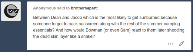 Jacob camps a lot, and is for the most part a more outdoorsy type than Dean is, so he’s more likely to tan (in addition to being Mediterranean, which helps his chances in the sun). Dean spends most of his days holed up in a room researching, with a good amount of his waking hours at night hunting spirits. He will burn quick before he tans if he’s not expecting it.