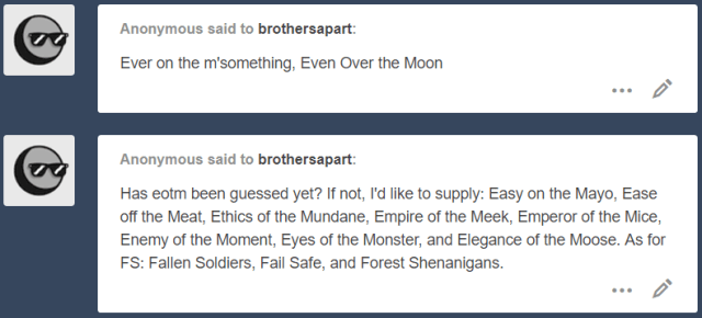 Fun ideas! Eotm has not yet been guessed yet, and neither has fs. These two are going to be twisting everyone up something special. They’re very unique names. One is based on the lyrics from a song that no one but @nightmares06 seem to listen to, and the second is what fit the story best… so it’s not something we even have any clues for.