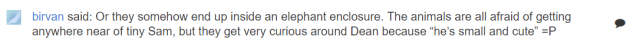 On January 13, 2018December 9, 2018 By nightmares06In Uncategorized Dean gets patted on the head with an elephant trunk, Sam has to sit in the corner so they stop freaking out around him. Send me some headcanons for distraction! Share this: Click to share on X (Opens in new window) X Click to share on Facebook (Opens in new window) Facebook Like Loading...