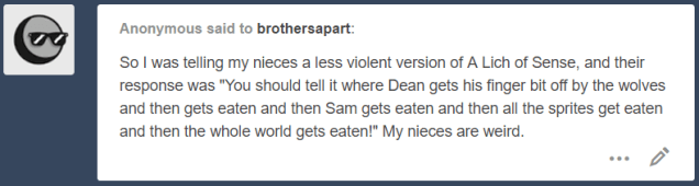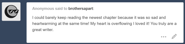 Brothers Found = Brothers Apart if Jacob came into it first. No more, no less. Until we stumbled over the idea for the horror story and the story grew into its own. And remember– this AU was the first we created and you have these stories to thank for all the others that came after.