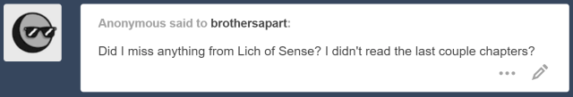 The story isn’t going anywhere, and the next story that posts has no relation to A Lich of Sense, so there’s plenty of time to read it!