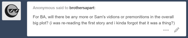 The visions are from when I first started writing the series, and they’ve been phased out in lieu of Sam’s knack. I found his new ability (and Dean’s, when he’s small), to be more fitting to the series as a whole.