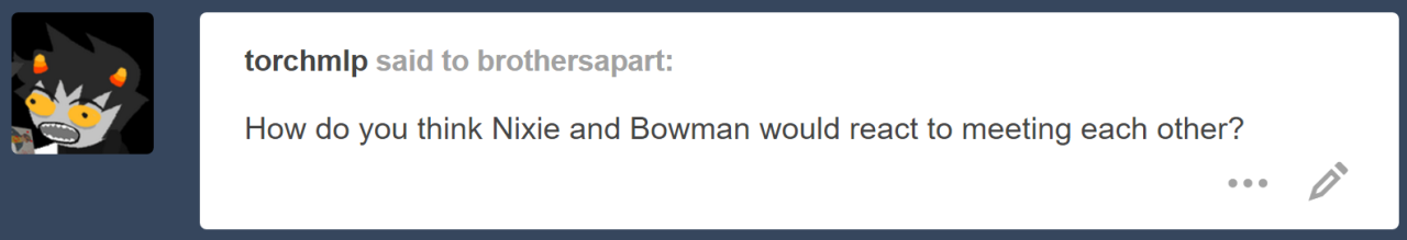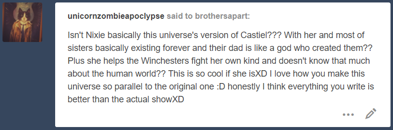 I also have Elias Dawn, a genderfluid/pansexual trickster that may someday make an appearance in the BA Multiverse!