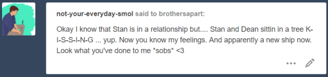 We did make a few ship names for them XD You’re not the only one that loves those two dorks. (St)an and D(ean) for Stean, and (Win)chester and Ba(ker) for Winker. Which do you guys like? Any other ideas?