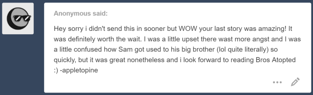 Glad to hear you enjoyed the story! Just remember, and this is important – the circumstances in Brothers Found are far different than the circumstances in Brothers Apart. In Brothers Apart, the first time Sam ran into Dean, not only was he cornered behind a nightstand, he was also injured and snatched up against his will. All of this makes it a lot harder to trust someone fast. In Brothers Found, Jacob was the one that hurt Sam – completely by accident! – and Sam worked up the courage to seek out Dean for himself. He traveled cross country to find his older brother and ended up being the one to defend Jacob from his older brother, making Sam realize he had more power in the relationship than he thought.