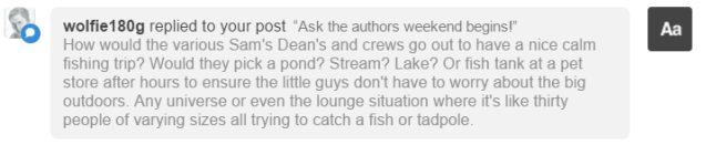 “You can go talk to anyone and rest wherever,” he explained to the nearby Sam. “There’s lots of everyone here, the other Jacob even came with a Sam and a Dean our size! The smaller Dean really likes the pie the bartender makes, I tried some and it’s good.”