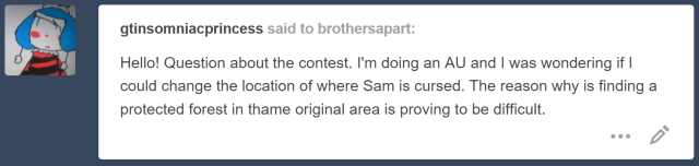Here’s a hint: I do not write Sam or Dean. That’s all up to nightmares06. You don’t need to guess which character I write, but only the premise of the AU, just like “Kid finds Sam” or “Sam meets other borrowers”. These guesses have a general idea that involves a character or characters that are not Sam and Dean Winchester.