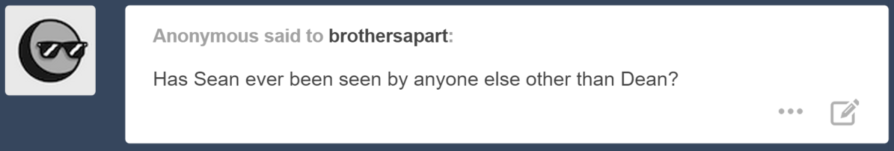 After a few minutes of cajoling, Sam finally peered up at Dean. His small eyes were wide, panicked. The look of a hunted animal. “D-Dean?” he stuttered out.