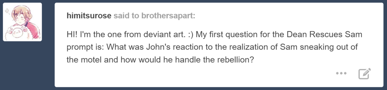 Fusses over his kid brother growing up. Will fight if anyone ever dismisses Sam in front of him. Only stands up to their dad if it’s Sam he’s standing up for. Sam will knock anyone’s lights out if they try and stop Dean from big brothering. Do not try to shush his big brother, thanks very much.