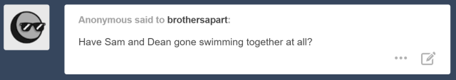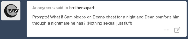 In line with there being a full-fledged story in development for the Dean Rescues Sam AU, I’m also renaming it Brothers Together after a friend suggested it. If you have any asks/prompts for the AU, feel free to submit them. They may possibly be incorporated into the story in development. Standard prompt rules apply.