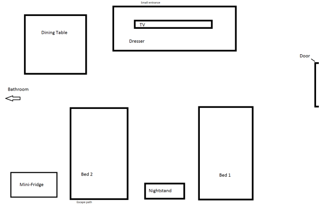 A diagram of the motel room that Dean had in Brothers Apart, when he first discovered Sam. The entrances used by Sam’s family have been marked.