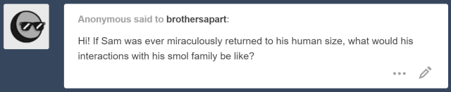 The person he held in his arms only bore a passing resemblance to the four inch hunter he’d had at his side, flinching away from Dean’s voice. Sam was massive and built, a good few inches taller than Dean himself. But those hazel eyes, despite the way they darted about in a panic, were the most familiar eyes he’d ever seen. His hair was a mess, ragged and longer than ever. His clothing was tattered. A massive hook hung out of his satchel, the three prongs glinting in the sunlight and the clear fishing line the thickness of Dean’s pinkie.