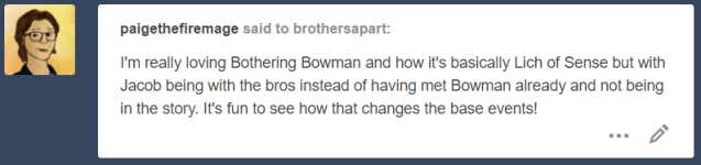 According to the timeline I was thinking of, Bowman would be about 20. Putting Jacob at 18 or 19. My characters are younger than the bros, and though Bowman doesn’t really care about age at all, it leads to a dynamic with Jacob looking up to the Winchesters (no matter what size everyone is).