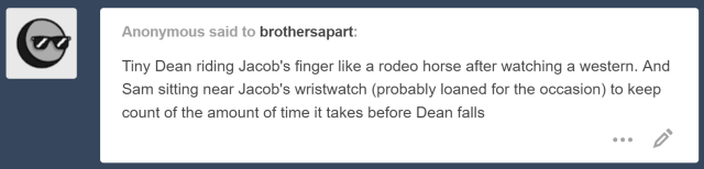 XD Aww, that’s an adorable image! I can just imagine how scolded Jacob will be when he ‘bucks’ Dean off and the little guy goes tumbling. Sam will snicker at how offended Dean is that he only lasted ten seconds, clearly he’s going to need more practice. Dean will not forgive Sam if he stays on longer when it comes time for his turn.
